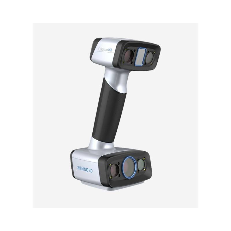 El Einscan HX de Shining 3D integra luz LED azul y l?ser azul en un formato de esc?ner de mano. Las fuentes de luz h?bridas hacen que el? EinScan HX sea compatible con un mayor rango de tama?os de objeto, cumpliendo de este modo con las necesidades de los usuarios.?El escaneado con luz LED permite un r?pido escaneado 3D, mientras que el escaneado l?ser, menos sensible a la luz ambiental, ofrece un mejor rendimiento a las superficies reflectantes y de color oscuro. Alta Eficiencia La velocidad de procesado del EinScan HX en el modo Rapid Scan es hasta 1,2 millones de puntos por segundo, y la multitud de l?neas de l?ser azul en el modo Laser Scan permite escanear la mayor?a de objetos en minutos, para ingenier?a inversa, CAD/CAM, impresi?n 3D, etc. Resultados fiables Alta resoluci?n y precisi?n para adaptarse a las necesidades de la mayor?a de las aplicaciones industriales para ingenier?a inversa y medici?n.?Distancia de puntos m?nima: 0,05 mm, y precisi?n de hasta 0,04 mm en modo l?ser Port?til y f?cil de usar EinScan HX es plug & play, con un software muy sencillo de utilizar por cualquier usuario, tanto profesionales como usuarios poco avanzados. La portabilidad y flexibilidad del esc?ner, junto con su dise?o ergon?mico, hacen que la experiencia de uso sea muy c?moda.? A todo color? La c?mara integrada en color permite el escaneado en 3D de texturas con color completo, as? como hacer el tracking por texturas.